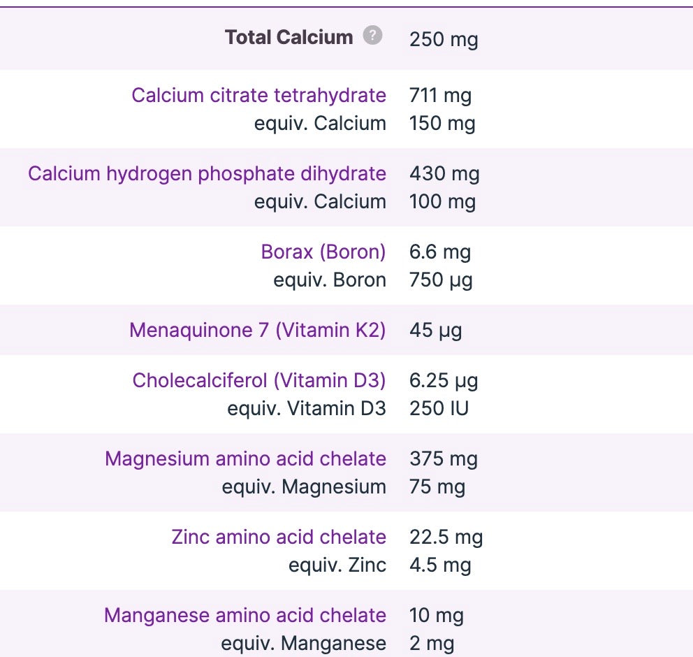 Calcium citrate tetrahydrate 711 mgequiv. Calcium 150 mgCalcium hydrogen phosphate dihydrate 430 mgequiv. Calcium 100 mgTOTAL CALCIUM250 mgMagnesium amino acid chelate 375 mgequiv. Magnesium 75 mgMenaquinone 7 Vitamin K245 microgramZinc amino acid chelate22.5 mgequiv. Zinc4.5 mgManganese amino acid chelate10 mgequiv. Manganese 2 mgBorax6.6 mgequiv. Boron 750 microgramColecalciferol6.25 microgramequiv. Vitamin D3250 IU