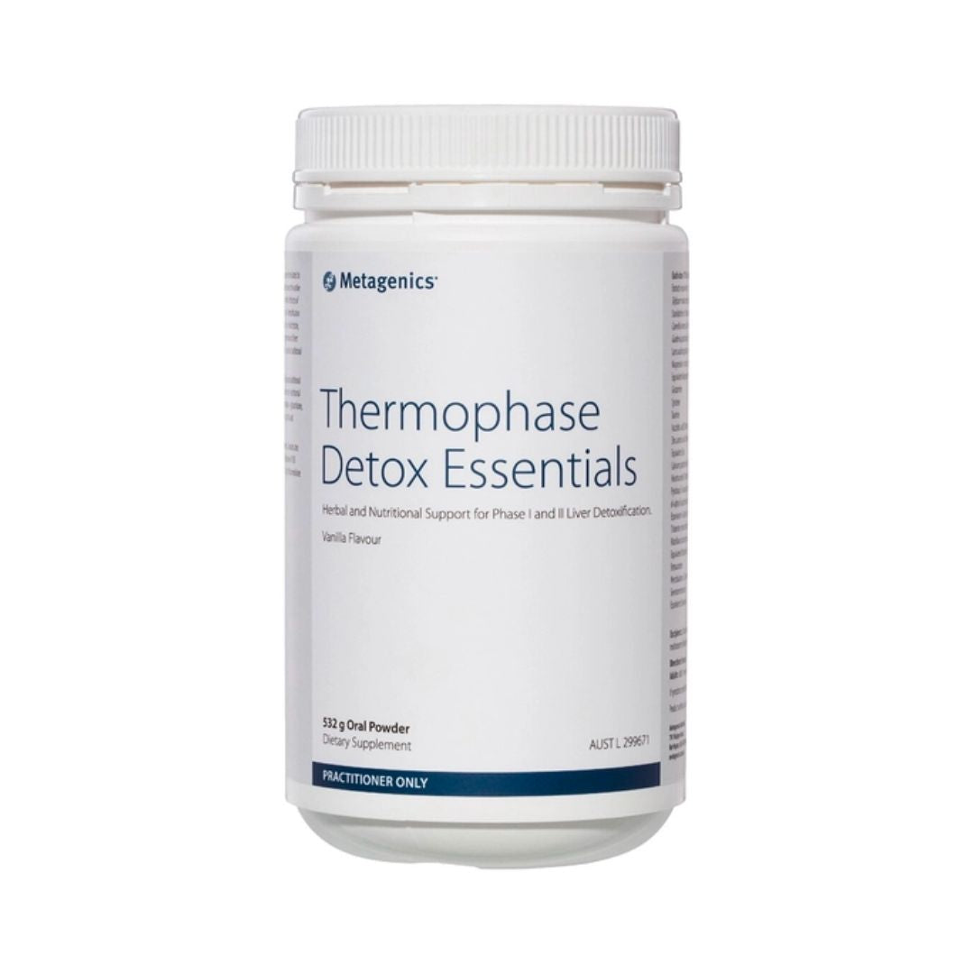 - This sumptuous formula helps support the gut and facilitates liver and cellular detoxification. With conjugating amino acids, milk thistle, and green tea to bolster liver detoxification and ward off reactive toxins, plus low reactive, non-GMO pea protein for enhanced patient tolerance, Metagenics Thermophase Detox Essentials 532g is the perfect accompaniment to any detoxification program.